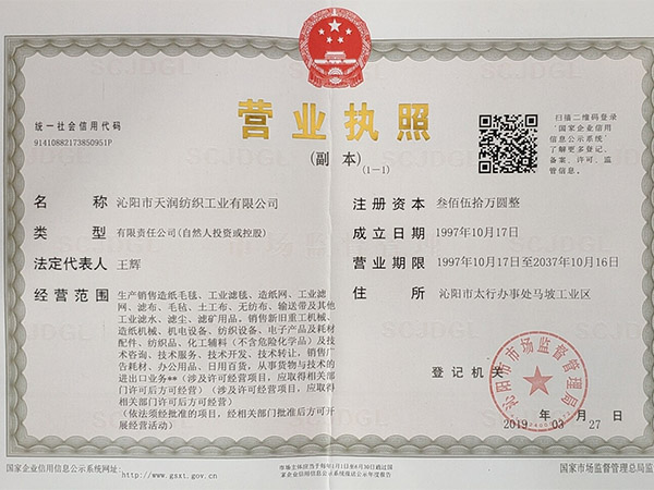 沁陽(yáng)市天潤(rùn)機(jī)械設(shè)備有限公司,成立于1997年,是世界造紙行業(yè)所需工業(yè)用呢(俗稱(chēng):毛毯)專(zhuān)業(yè)生產(chǎn)公司